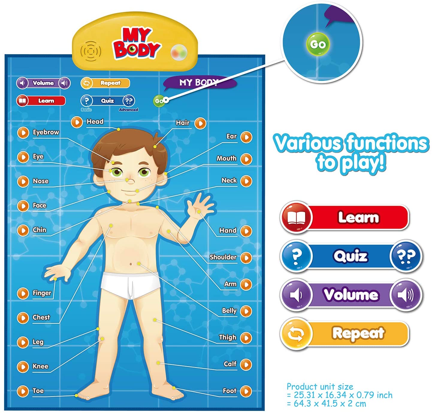 An interactive poster enables visual and knowledge to explore the human anatomy. Engage in fun learning activities on how amazing our body works! Discover how our body parts, organs, muscles, and bones function. Friendly voices, music, and flashing lights to guide children through this playful learning experience.