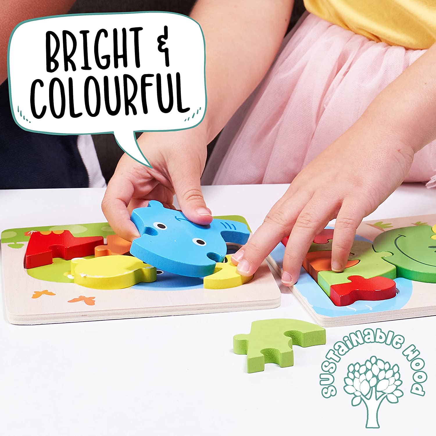• HIGHEST QUALITY | Wooden Toys with water based paint for hours of safe play with Smooth solid jigsaw bases with sturdy attractive lightweight illustrated puzzle bases with slots for each animal – Specially designed jigsaw puzzles for children