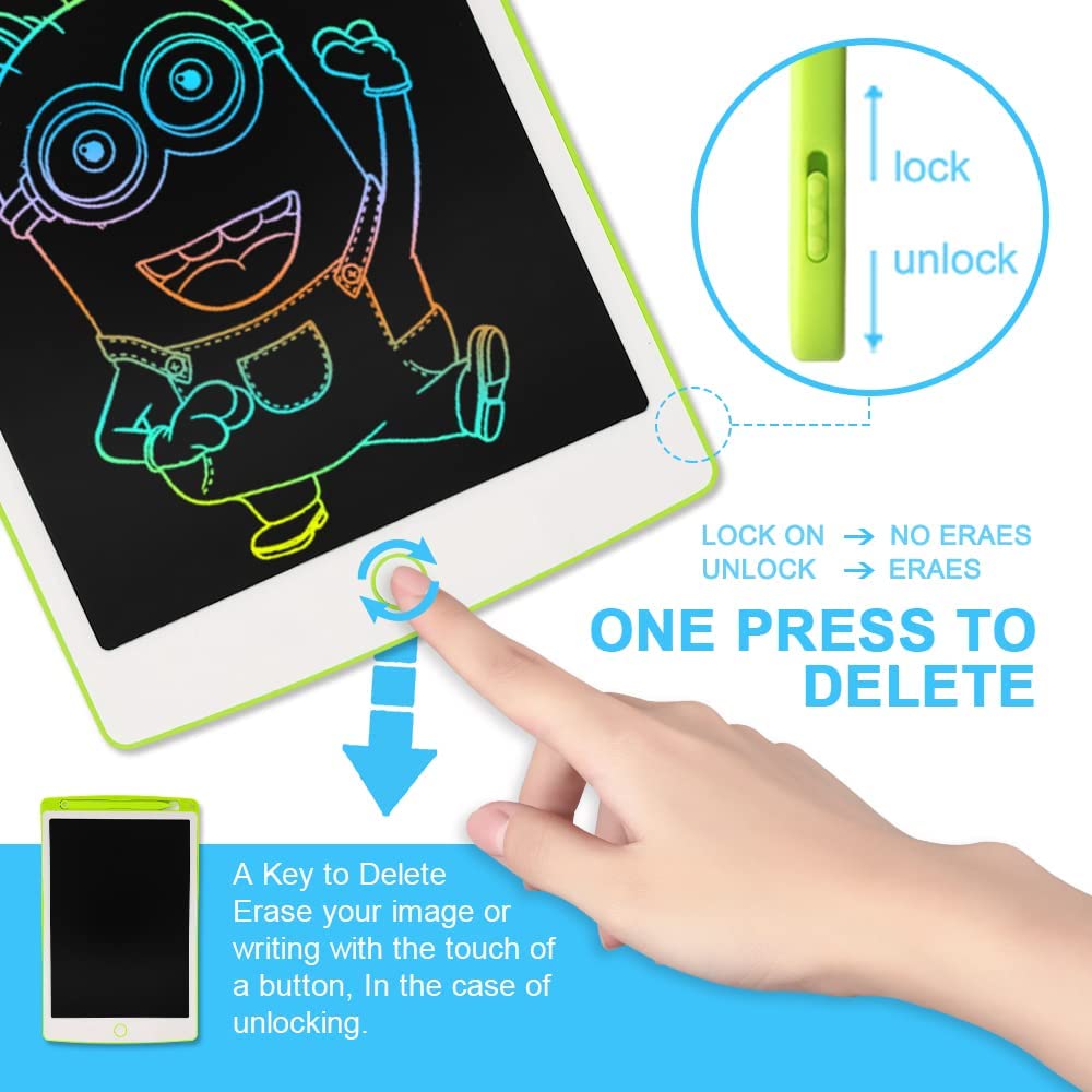 - 10 inch Kids Writing Tablet】- Richgv LCD Graphic Tablet is easy to delete images or words with single button. No electromagnetic radiation, safe for children and adult eyes. The lock switch prevent accidental deletion. Turn it off, press the erase button to quickly clear the screen