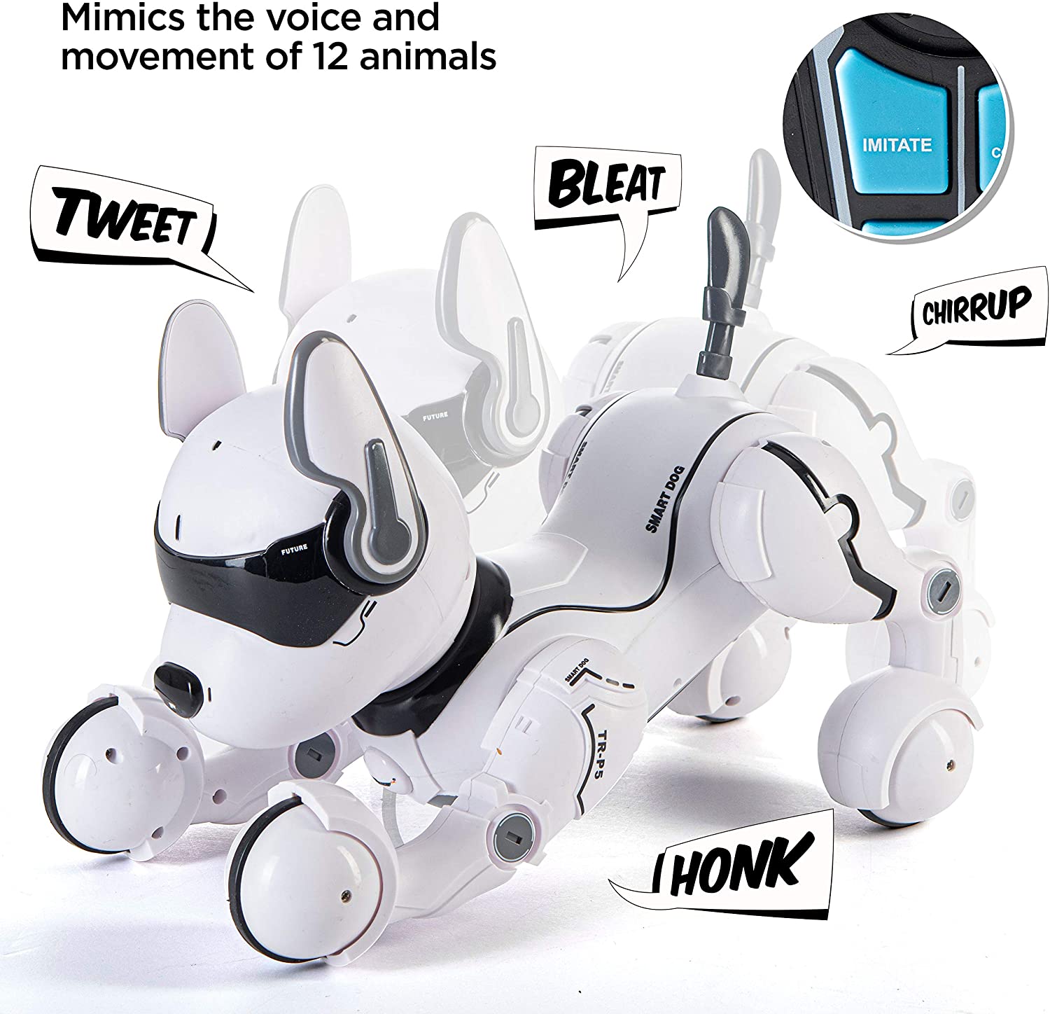 Top Race Voice Controlled and Remote Control Smart Robot Dog Personal puppy pet, robot for kids ages 3,4,5,6,7,8,9 and up. 12 Voice Directives, Imitates 10 Animal Forms, 7 Function Remote Control Robot toy for kids. SINGING DANCING: Dances with Music and does lifelike movements, your kids will love this for a birthday gift.