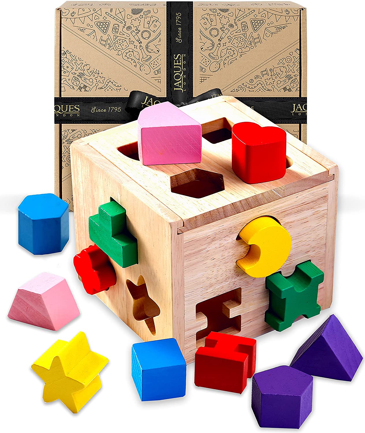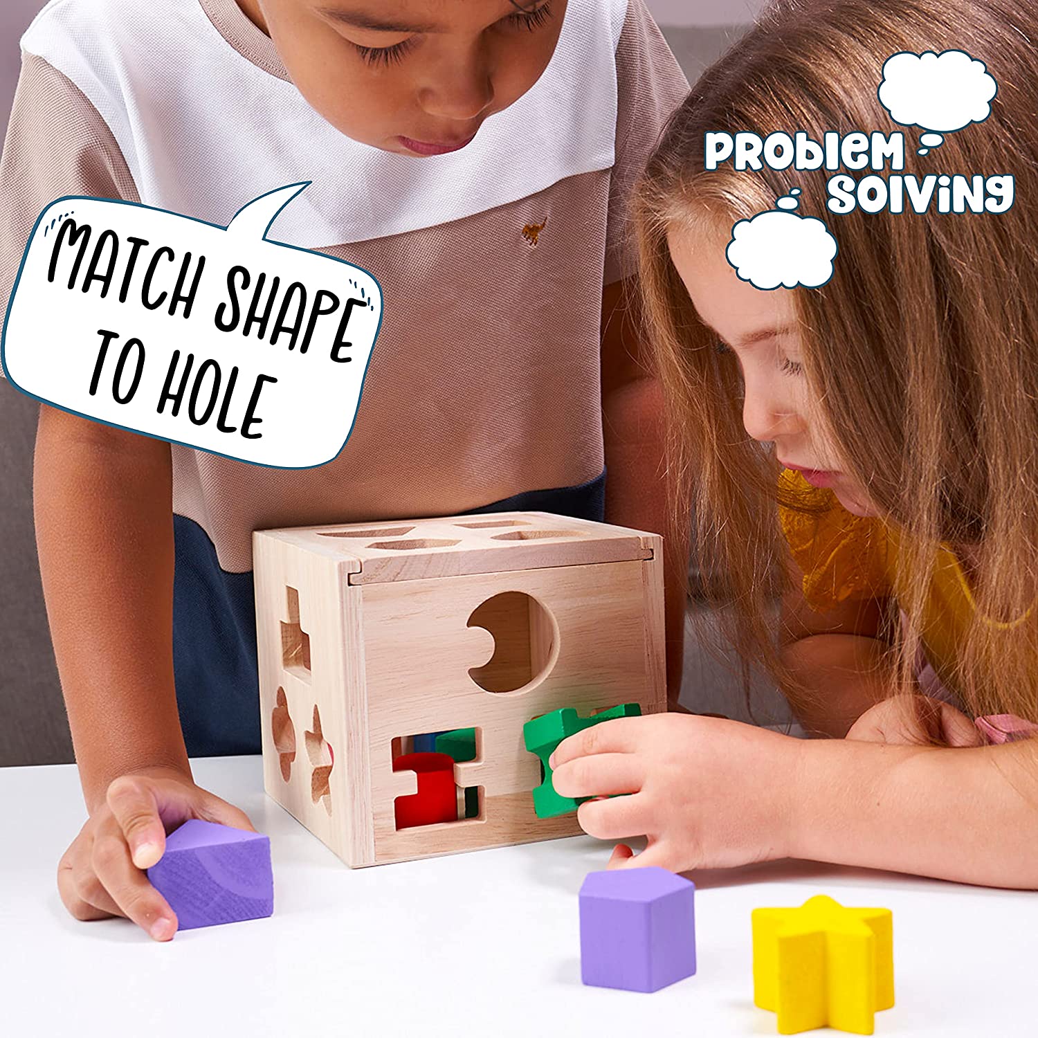 Unwrap your Wooden Activity Cube to reveal a world of toddler teaching wonder. Complete with 1 wooden cube with 3 shape cut-outs per side, 1 slide off lid with 4 shape cut-outs, 13 multi-coloured sorting blocks.